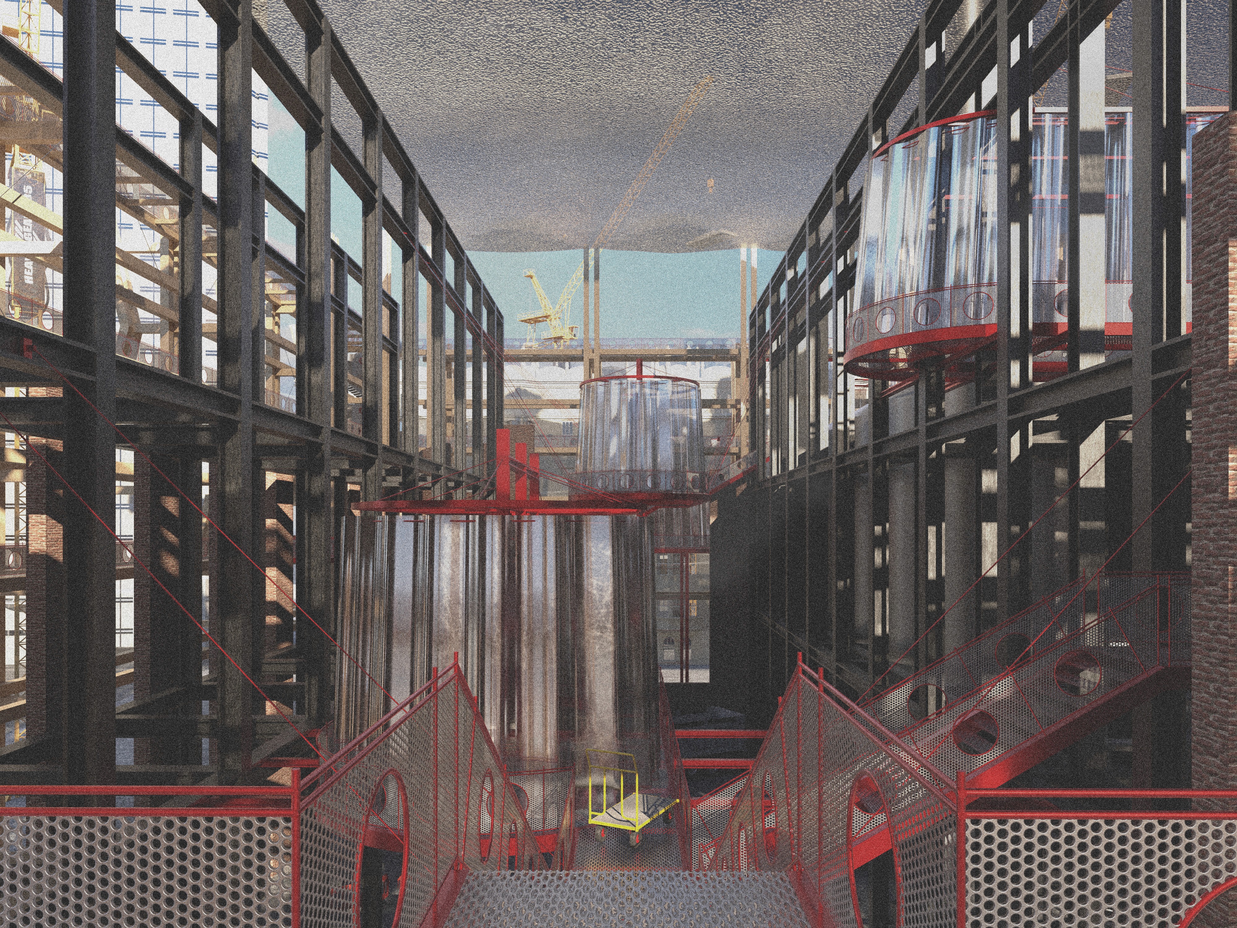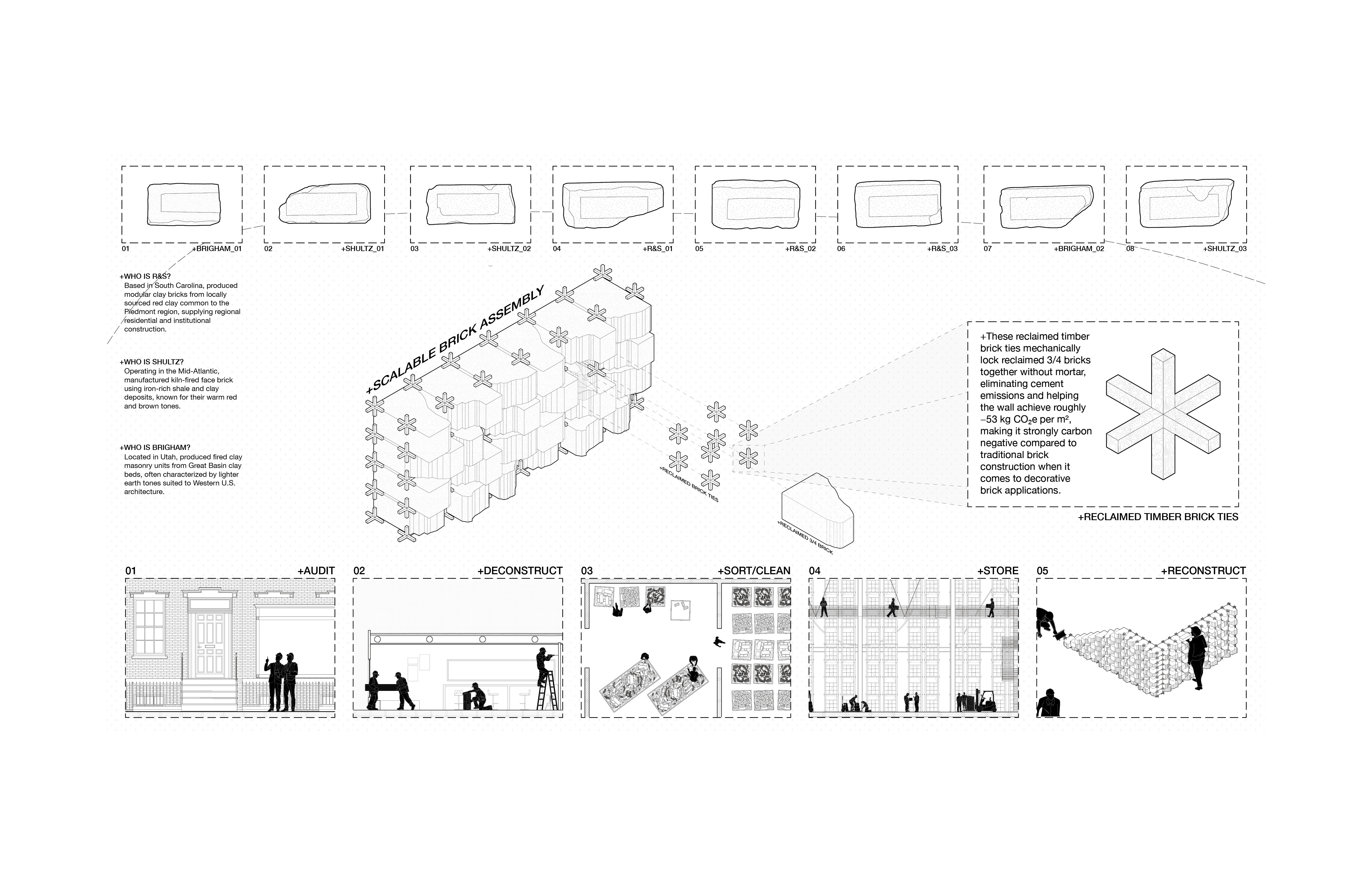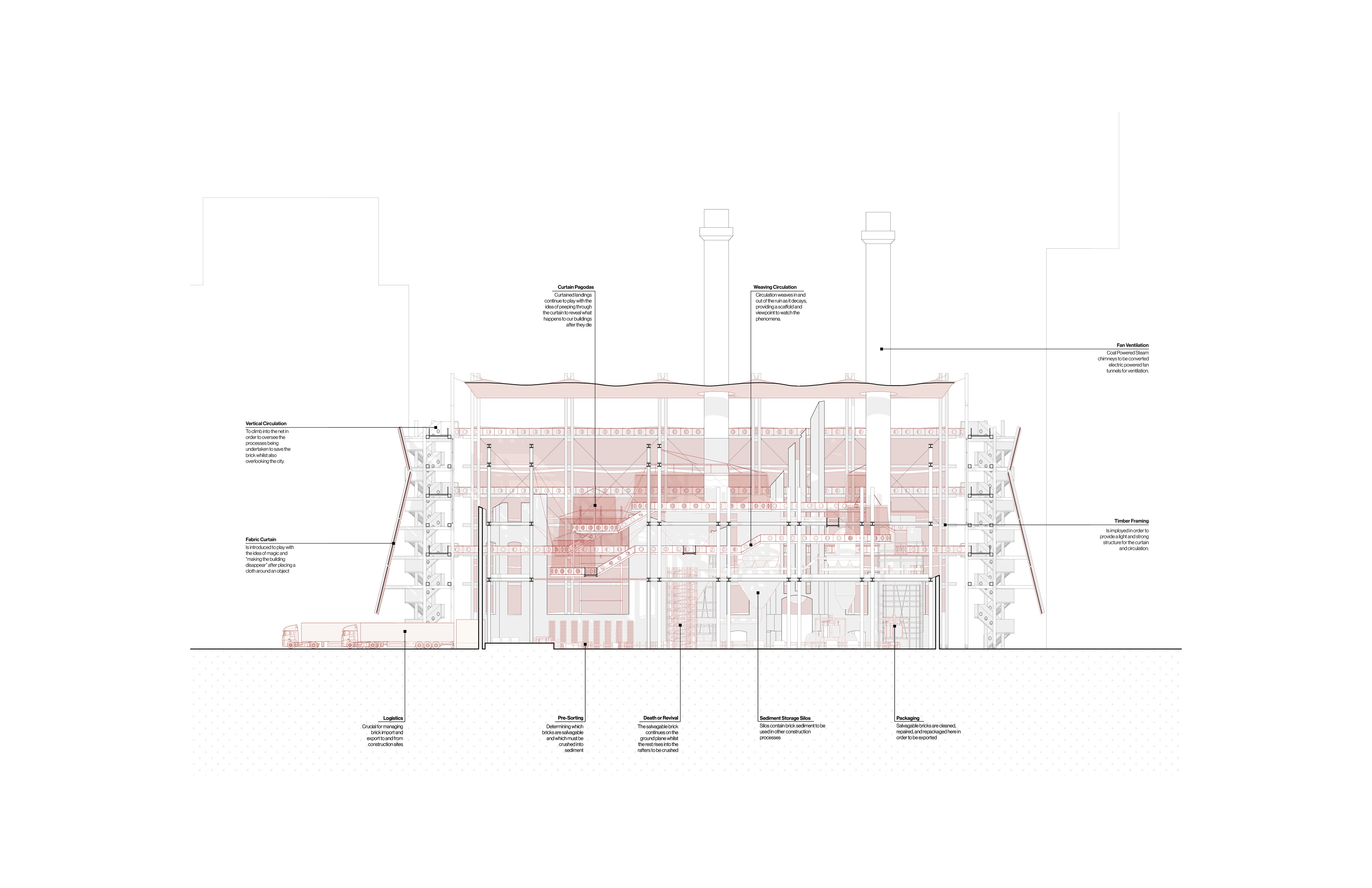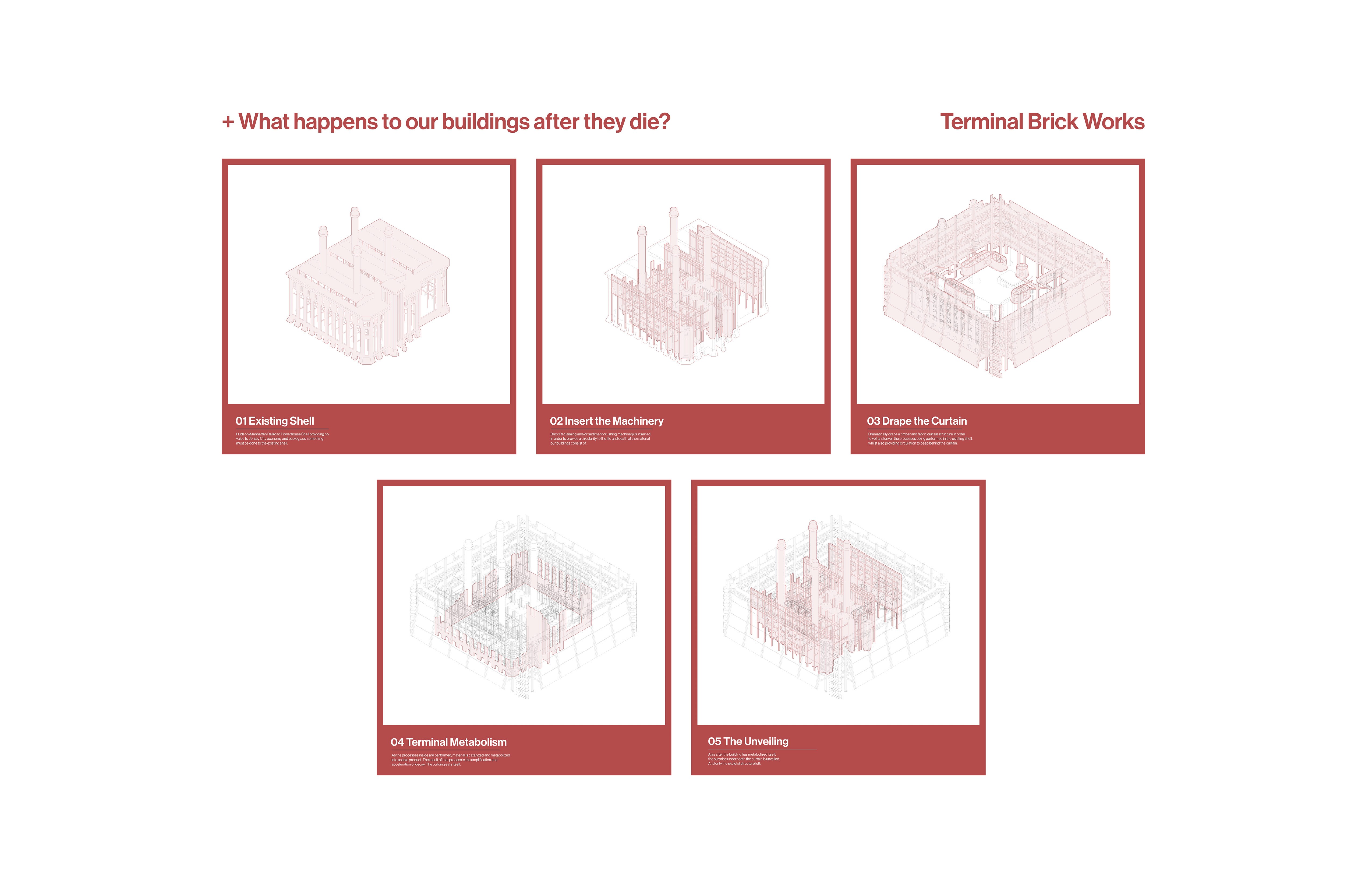 What happens to our buildings after they die? Terminal Brick Works operates as a brick reclamation facility inserted into the existing shell of the Hudson and Manhattan Railroad Powerhouse in Jersey City, treating the structure not as a preserved artifact, but as an active participant. A curtain scaffold wraps the building, drawing from the language of magic to veil and reveal industrial processes while inviting public observation through movement and visual permeability, also functioning as a protective filter, capturing brick dust and shielding the surrounding city. Within, brick collected from across the region is either restored into reusable units or crushed into sediment, returning it to an elemental state. Over time, the host structure is gradually dismantled and consumed by the systems it contains. The building shifts from container to participant until only the curtain scaffold and machinery remain, leaving behind a visible trace of architecture’s afterlife.