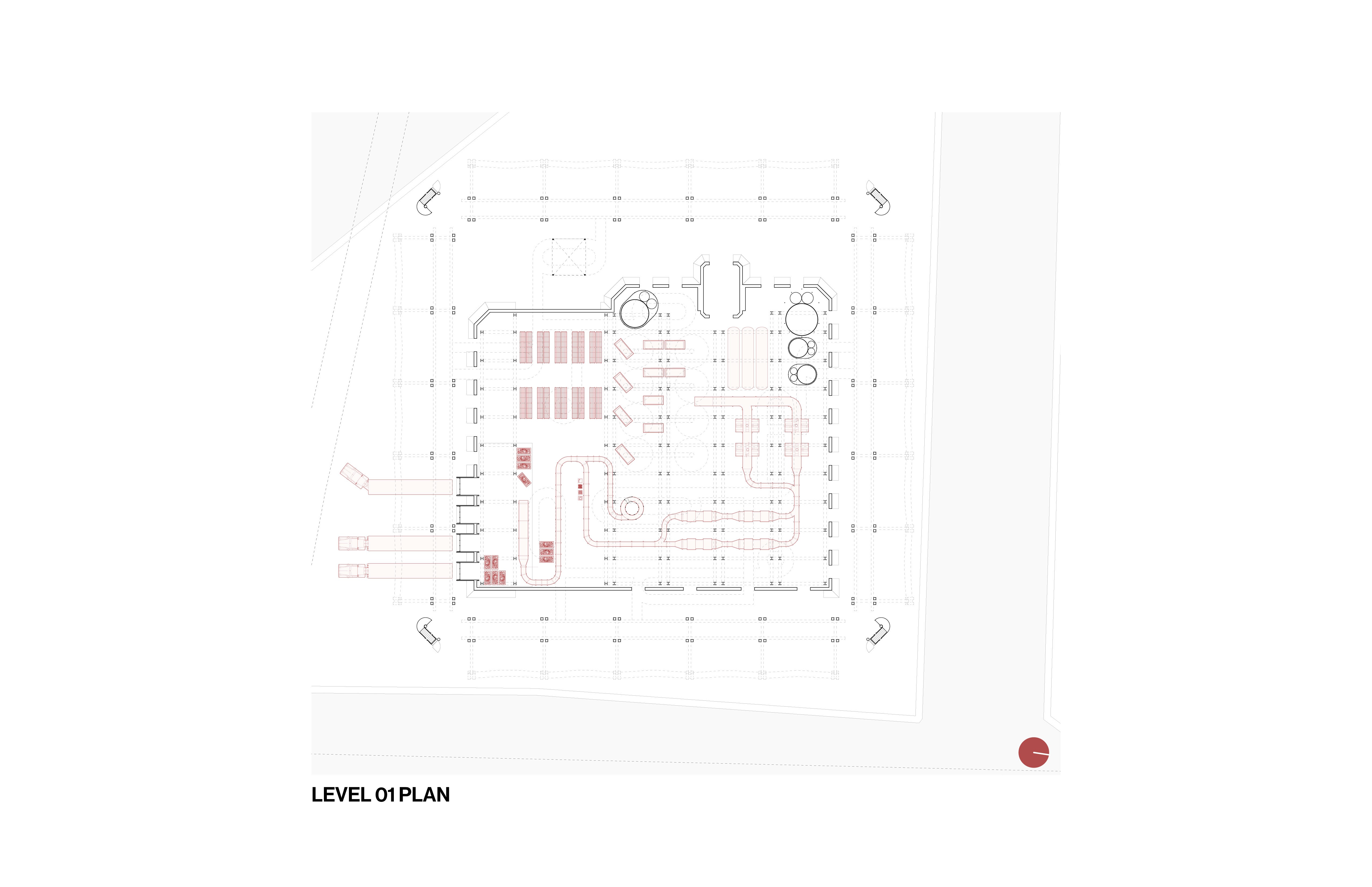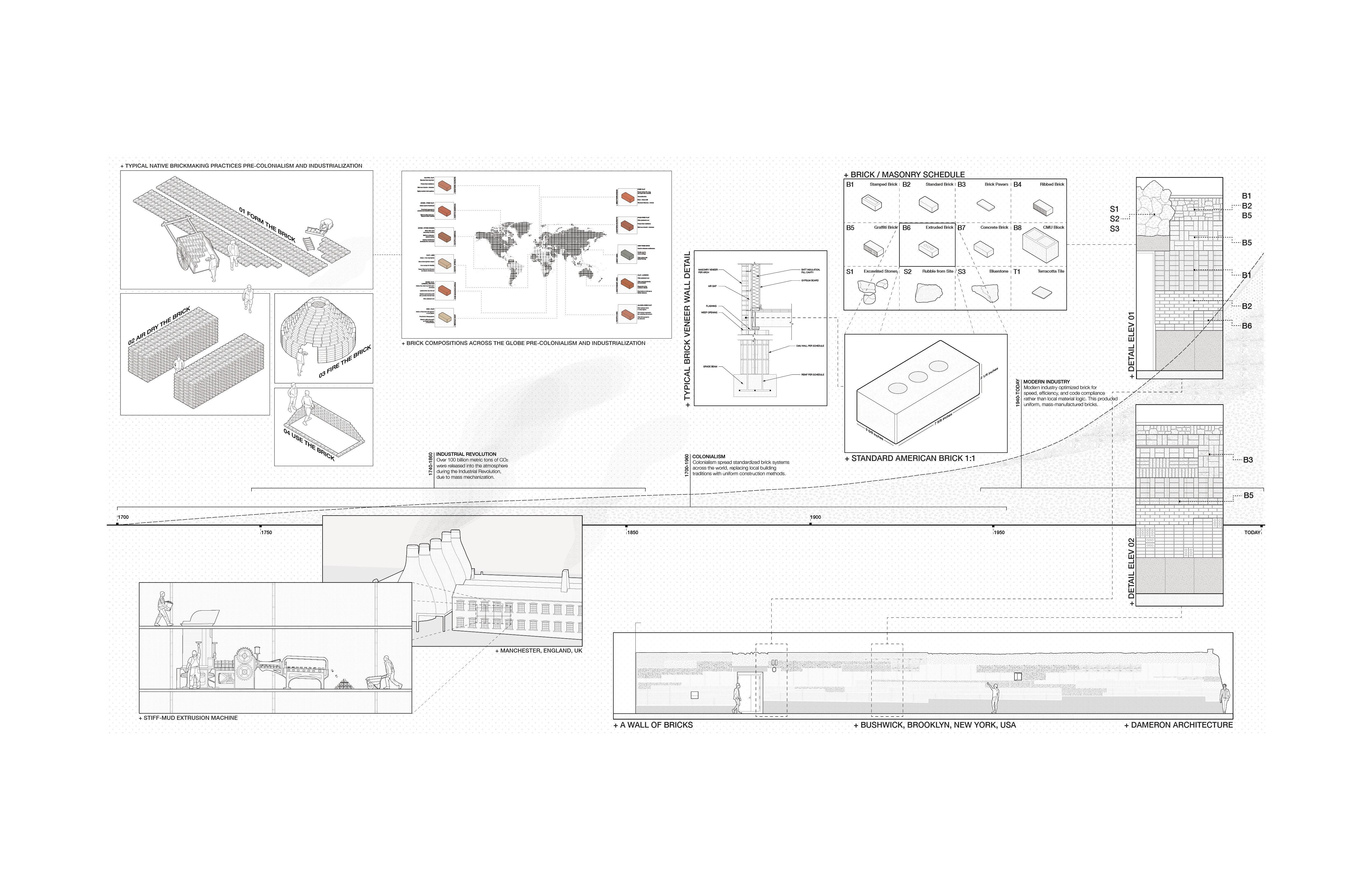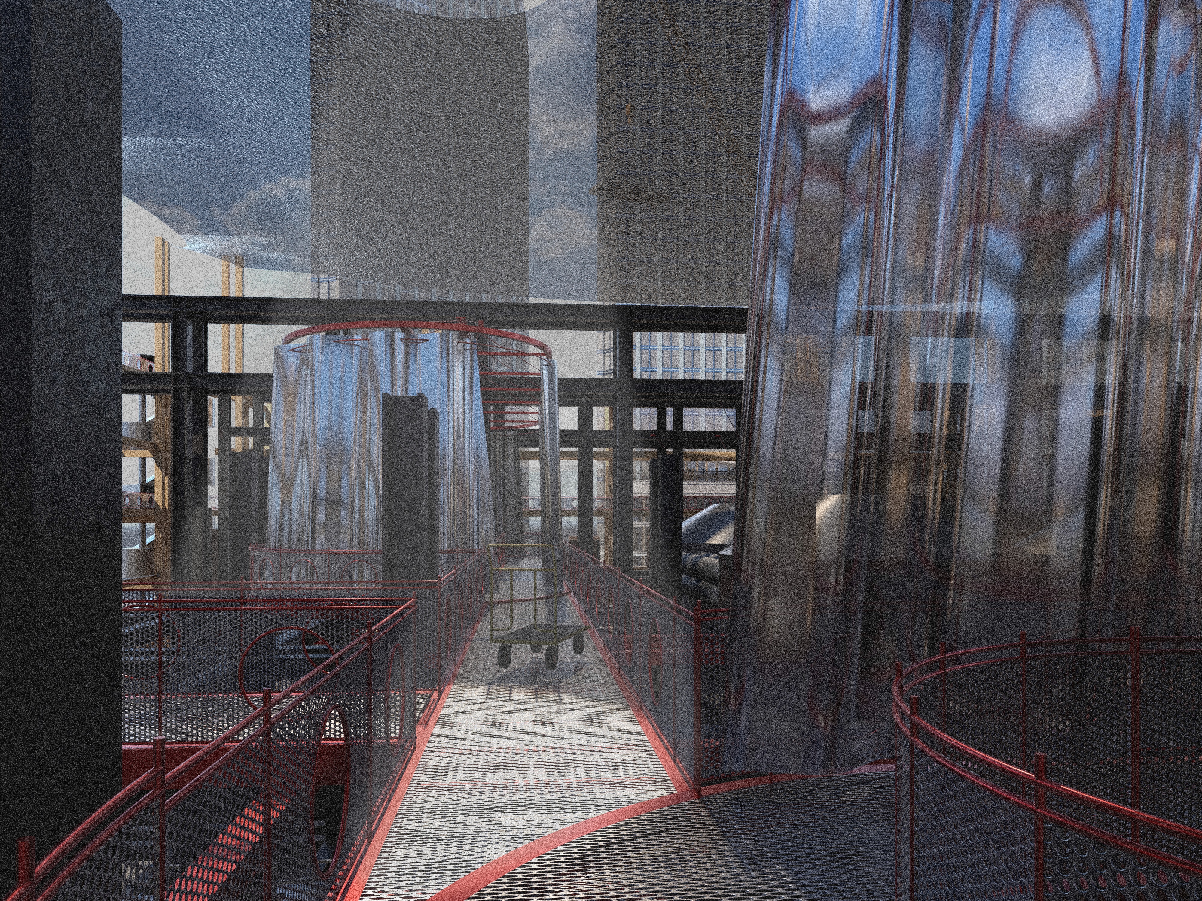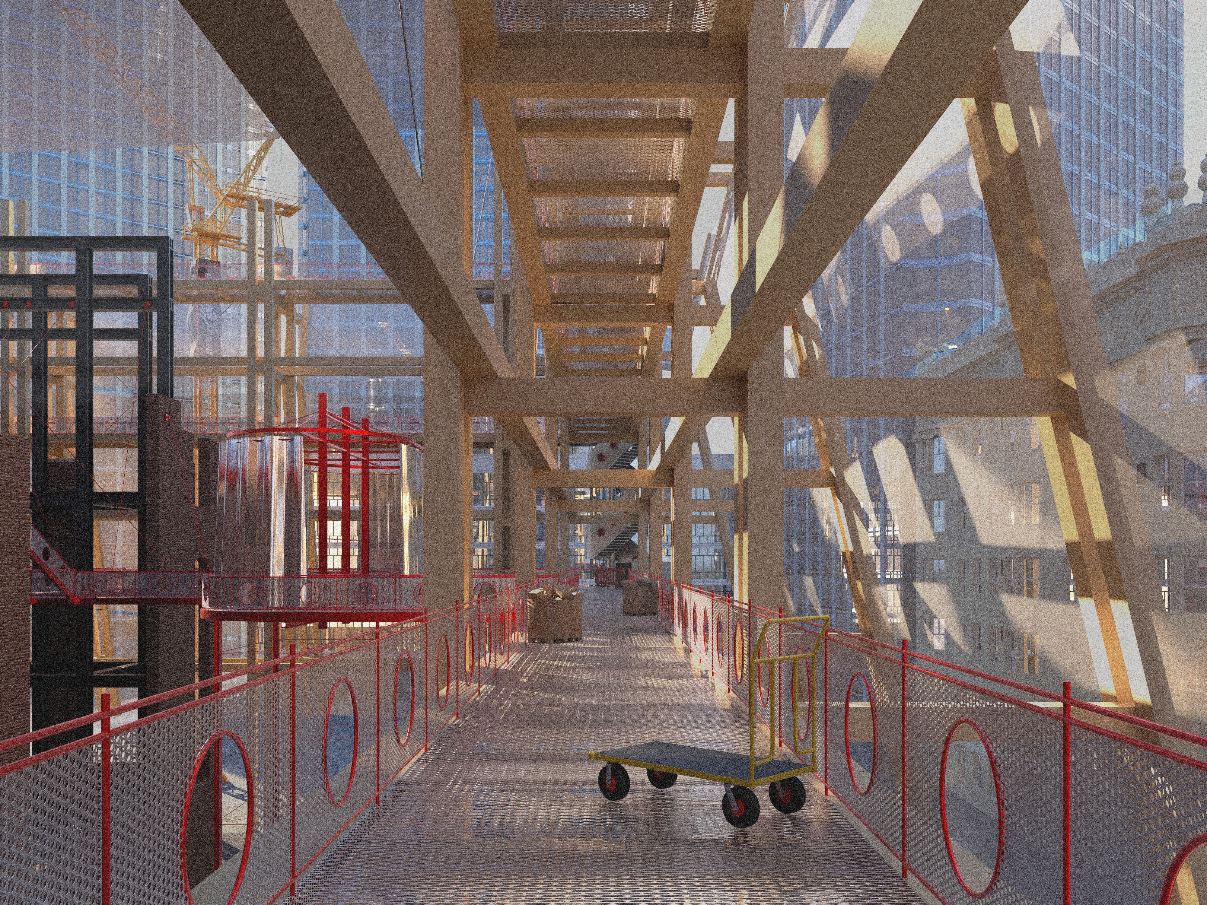 What happens to our buildings after they die? Terminal Brick Works operates as a brick reclamation facility inserted into the existing shell of the Hudson and Manhattan Railroad Powerhouse in Jersey City, treating the structure not as a preserved artifact, but as an active participant. A curtain scaffold wraps the building, drawing from the language of magic to veil and reveal industrial processes while inviting public observation through movement and visual permeability, also functioning as a protective filter, capturing brick dust and shielding the surrounding city. Within, brick collected from across the region is either restored into reusable units or crushed into sediment, returning it to an elemental state. Over time, the host structure is gradually dismantled and consumed by the systems it contains. The building shifts from container to participant until only the curtain scaffold and machinery remain, leaving behind a visible trace of architecture’s afterlife.