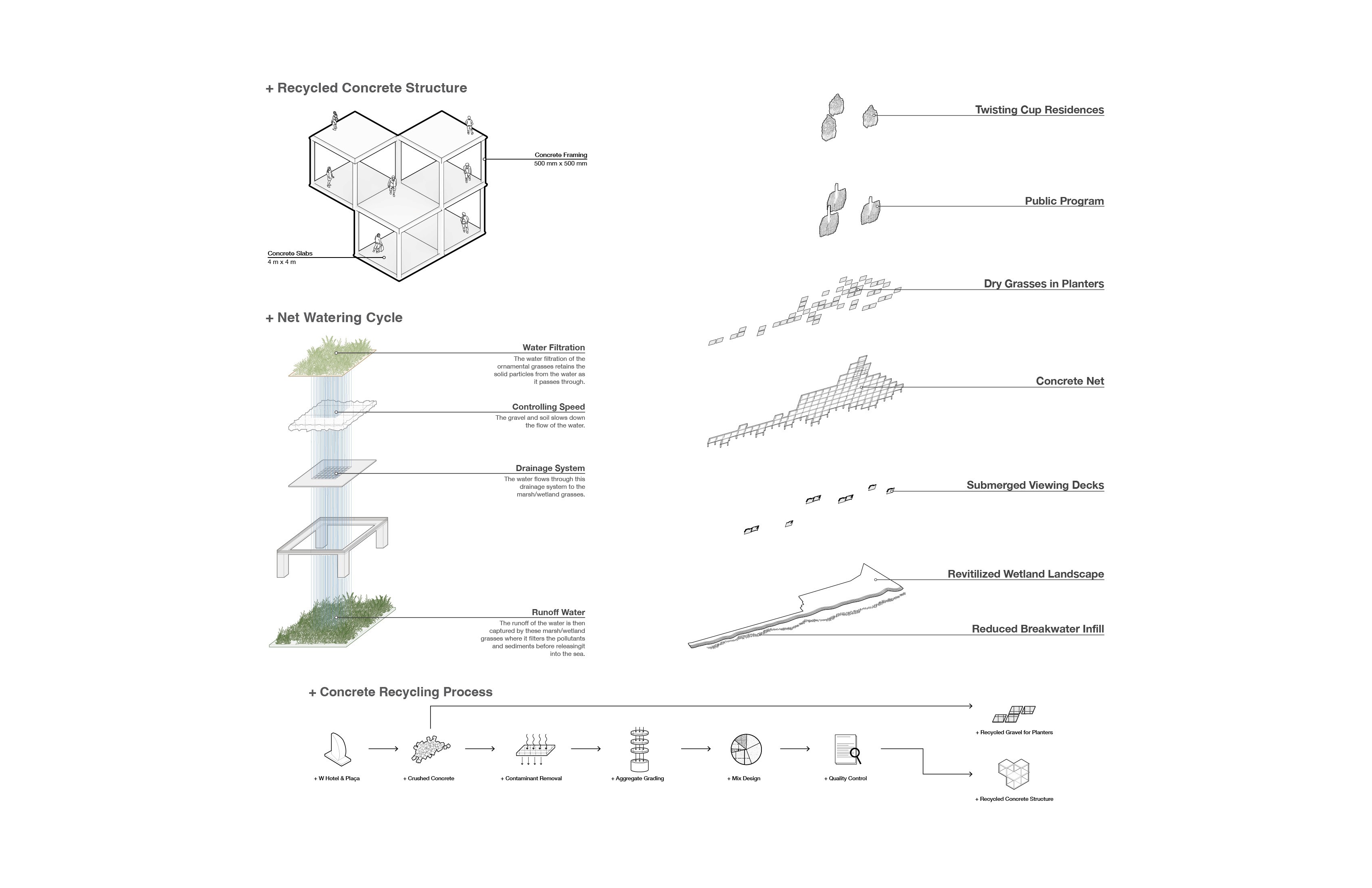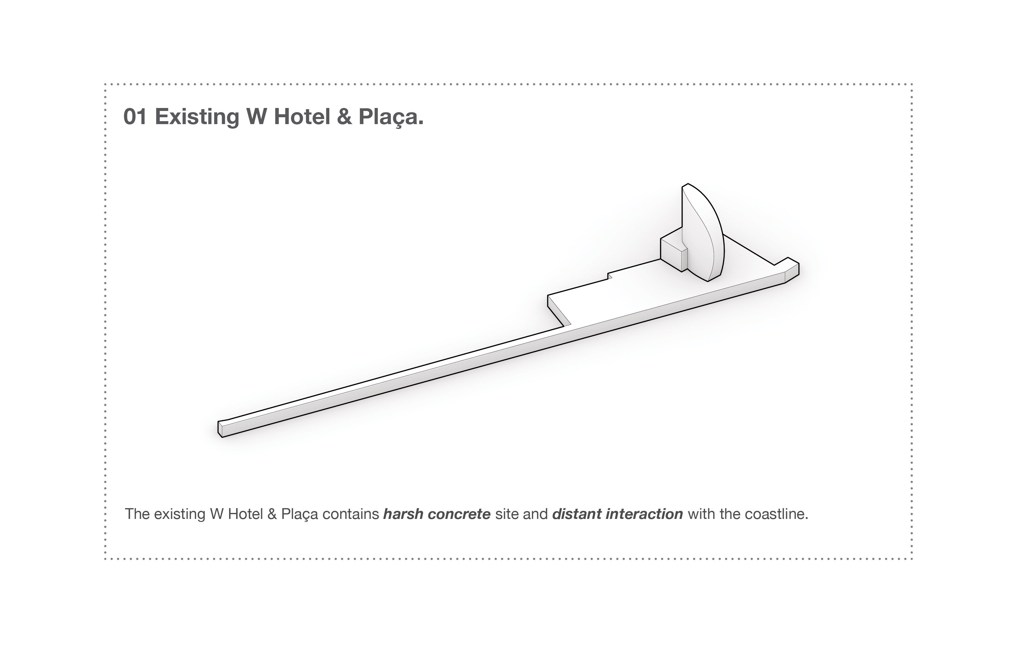 After visiting the current W Hotel Barcelona and Plaça in Barceloneta Beach, we observed that there was a tremendous amount of concrete, whether that be hardscape pavement, the nearby buildings or the breakwater protecting the coastline. The extreme amount of concrete creates a harsh site and a distant interaction with the Mediterranean Sea’s coastline. The aim of this project is to foster a closer interaction between the visitors Mediterranean Sea. This was done by recycling the entire site, from the concrete used in the Plaça, W Hotel, and the landscape. Built as a hub for the America's Cup sailing races, Terra Marina also hopes to serve citizens of Barcelona during and after the races as an interactive and provocative connection between visitors, our landscape, and the Mediterranean Sea.